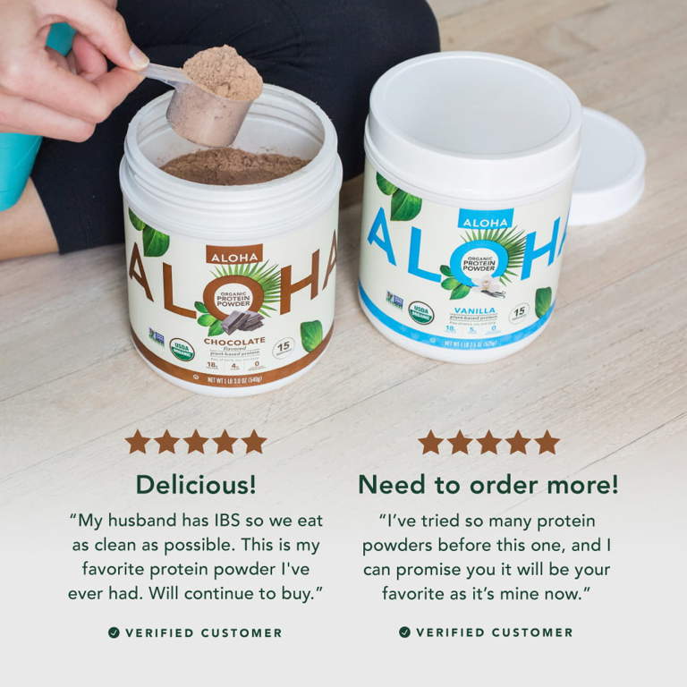 ALOHA Organic Plant-Based Protein Powder is a vegan protein powder with 18g of clean, organic, plant-based protein per pouch. It contains 200mg omega-3s and provides an excellent source of magnesium & iron. It is also USDA Certified Organic Non-GMO, Gluten-Free, Dairy-Free, Soy-Free and Vegan.
